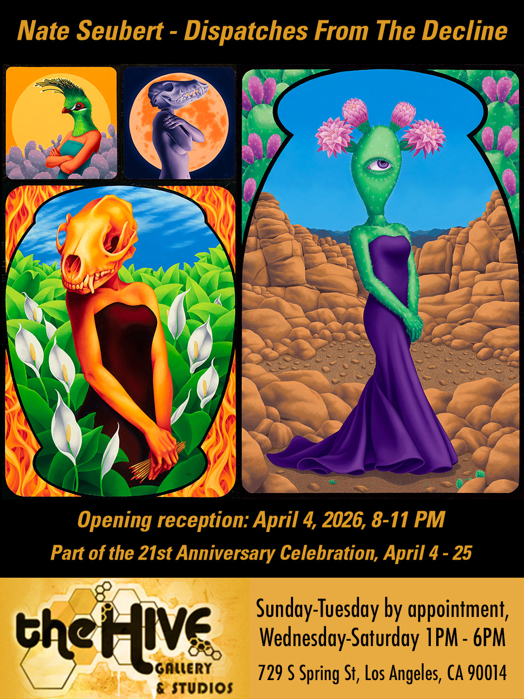 I'll have a bunch of pieces on display in April as a featured artist, as part of the 21st Anniversary celebration at The Hive Gallery in LA, CA. Check out the show card for more info. Show opens April 4, runs through the end of the month. Check it out, if you can!